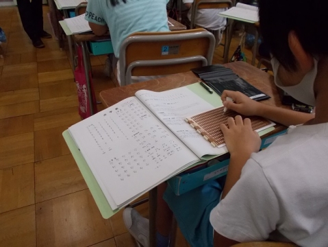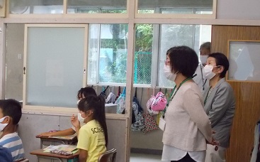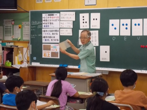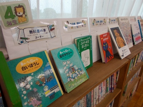 図書館は、図書館の先生がいて、子どもたちが読書に親しめるように、いろいろと環境を整えてくれています。現在は、学年ごとに教科書に出てくる本のコーナーが設けてあります。