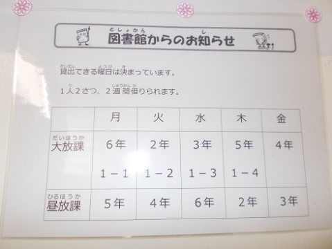 今日は、大放課が5年・1の4、昼放課が2年です。2冊まで借りることができます。