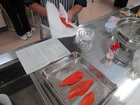 ・鮭の下ごしらえをします。(塩、こしょう、小麦粉)