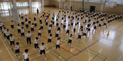 体育館を覗くと、全校演技(ダンス)「北中の舞」の練習を3年生が行っていました。