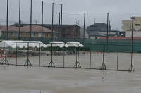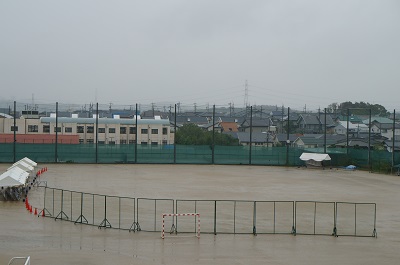 11時現在、天気予報通りに雨は弱くなり、少し明るくなってきたようですが、結構な量の雨が降りグランドは水が浮いています。