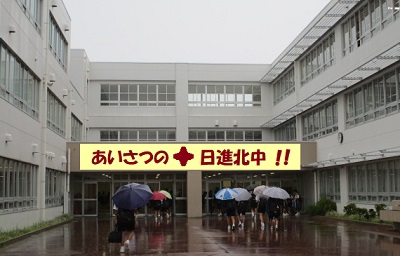 正門、岩崎台3丁目信号、岩崎台押しボタン信号付近に役員や地域委員の皆さんが立たれてあいさつ運動を行いました。