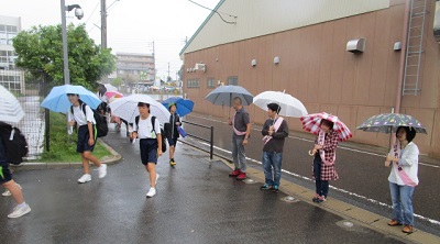 こんな悪天候の中でも、その強い責任感から「おはようございます」の力強いあいさつを子どもたちにかけていただきました。