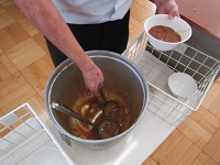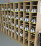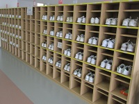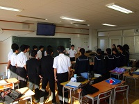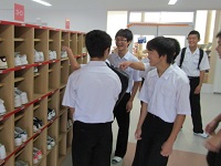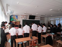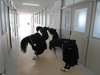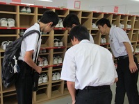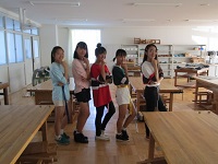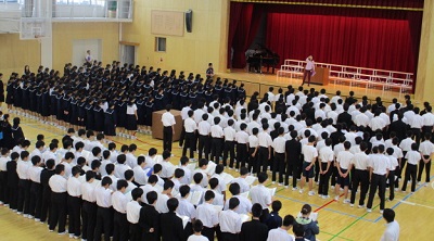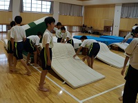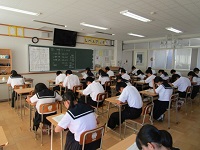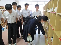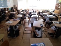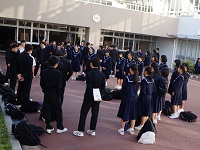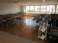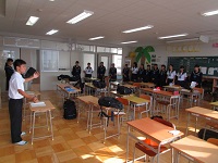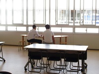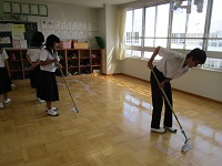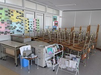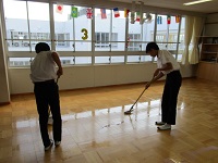 教室の机、椅子をすべて廊下へ出し、美化環境委員と有志が残って掃除をし、ワックスをかけて明日まで乾かします。