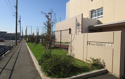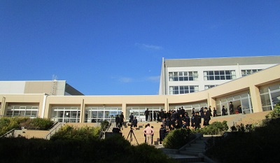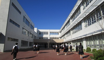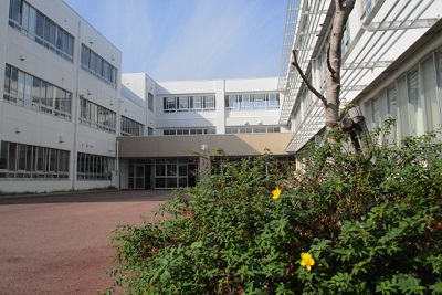 スカイブルーと芝生の緑と、校舎のベージュとのコントラストが映えます。
