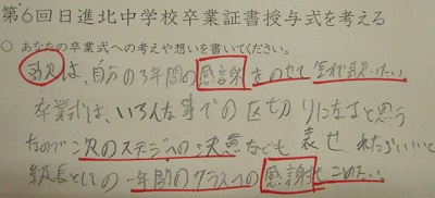 また、1年生学年委員は午後、香久山小学校と竹の山小学校を手分けして訪れ、6年生に北中学校の様子を説明し、質問に答えてきます。