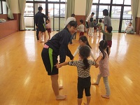 元気いっぱいの年長、年中、年小さんたちと、手を取り合って、オルガンの音に合わせてリズム遊びをしています。
