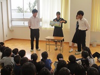 本日昼放課、図書委員会の子どもたちが併設の竹の山小学校へ出向き、低学年を対象に読み聞かせを行いました。
