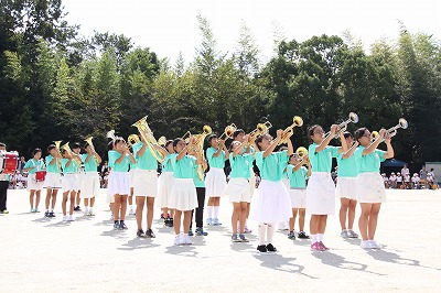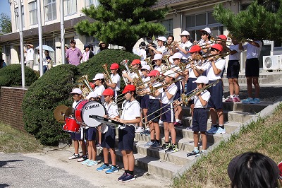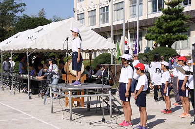 児童代表の言葉です。その後、校歌を金管バンド部の演奏に合わせて歌いました。