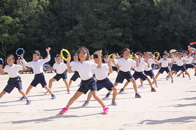 3・4年生全員がタンブリンを持って、リズムよく表現運動に取り組みました。