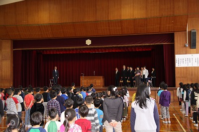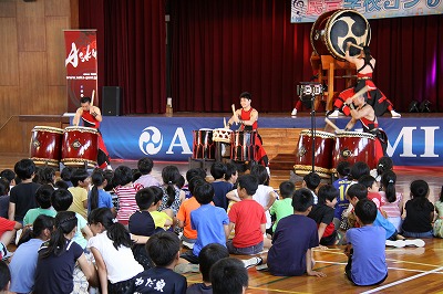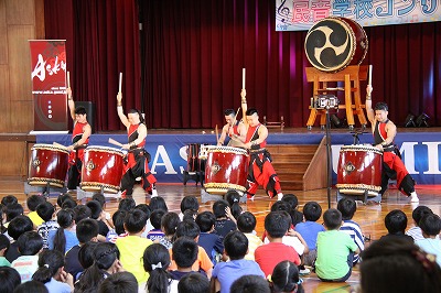 日本の伝統音楽の鑑賞の授業として、和太鼓を中心に活動している「舞太鼓 あすか組」のみなさんに来ていただきました。