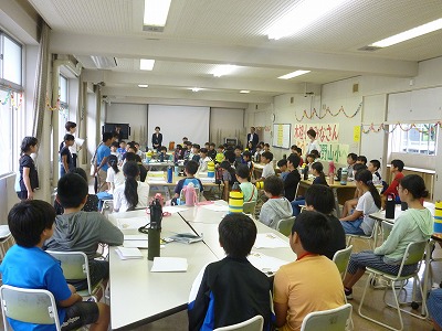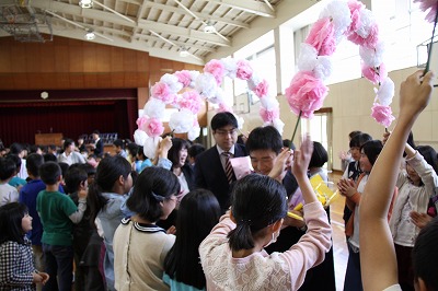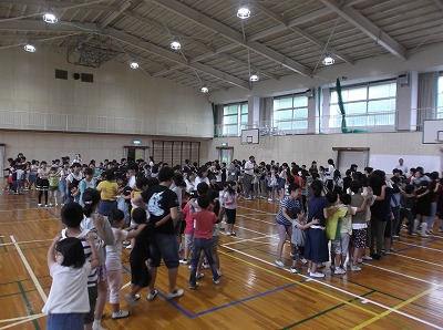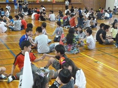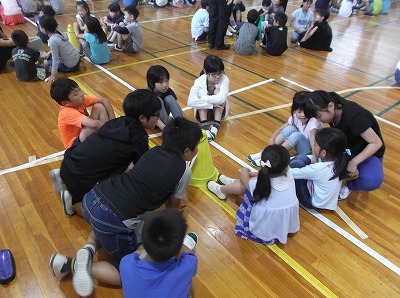 この日は、その「あいかつ」班のメンバーで初めての顔合わせ。全校262人を、28の班に編制しました。それぞれに担当の先生が決まっています。6年生が中心になって自己紹介をし合い、ゲームやじゃんけん列車で楽しみながら関係作りをしていきました。