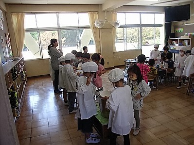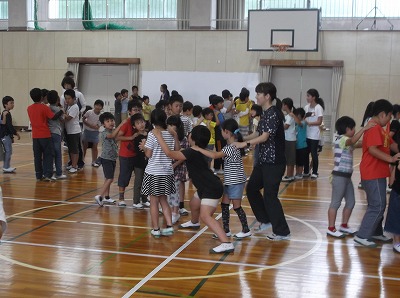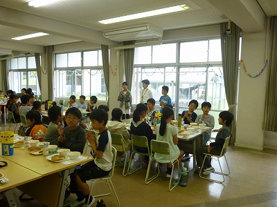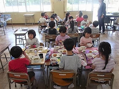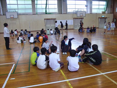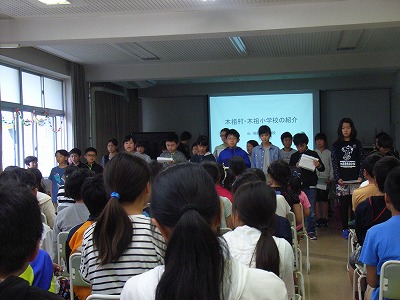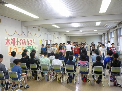 まず、なかよしルームで双方の学校紹介などしたあと、体育館で班ごとに自己紹介し合ったり、スプーン障害物リレーを楽しんだり、大きなボールでドッジボールを楽しんだりしました。そして一緒に給食を食べた後、名残は尽きないものの、お見送り。7月に木祖小で行われる交流会での再会を固く約束していました。
