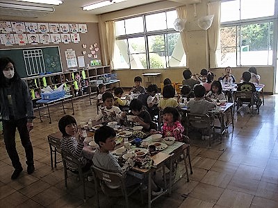 初めての給食です。お祝いでお赤飯でした。おいしく食べられたかな?