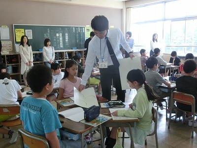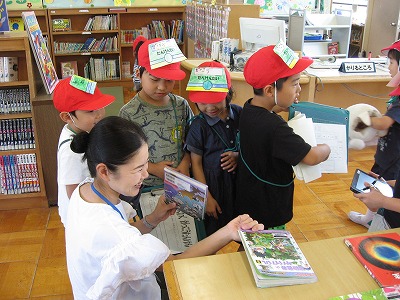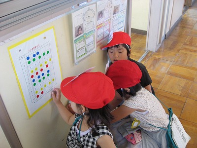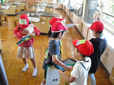 1年生が、グループごとに学校内を探検しました。それぞれの場所でミッションがあり、たとえば校長室では「自分の名前を言って、校長先生に握手してもらい、シールをもらう」というものでした。いろいろな場所を見て、いろいろな人とふれあいました。