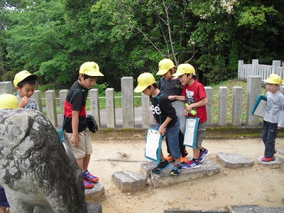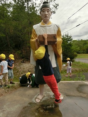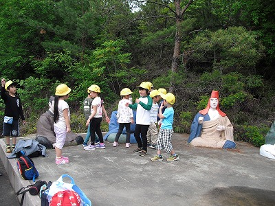初めての校外学習です。人物の彩色コンクリート像が人気でした。ただ、行き帰りはふだんの通学路とほとんど変わらない子も・・・・。