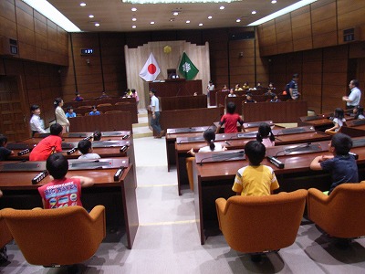 その後、市議会の議場を見学。議員席や答弁席に座らせてもらってご満悦でした。
