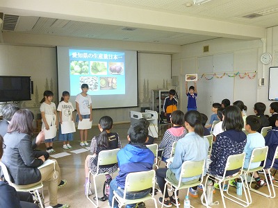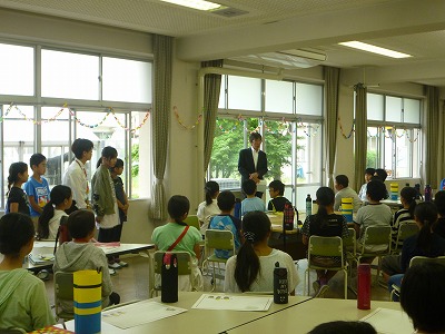 3年生は毎年、鈴木さんから学校近くの田んぼをお借りして、田植えと稲刈りの体験をさせていただいています。今年も、5月18日に田植えをしました。その後は、月に2度ほど、田んぼの様子を見に出かけています。また、一人ひとつずつのバケツで、学校で稲を育てています。今日は、鈴木さんに来ていただき、この後稲がどう育っていくのかや、稲と米の関係、農家の仕事などについて、いろいろと教えていただきました。