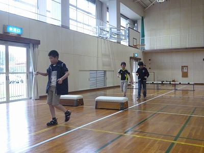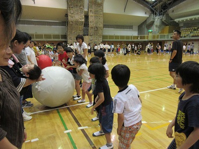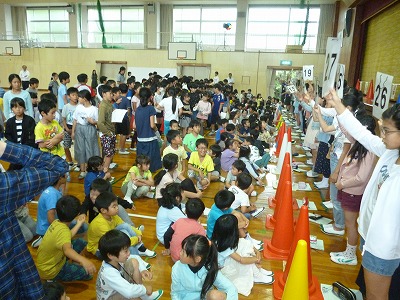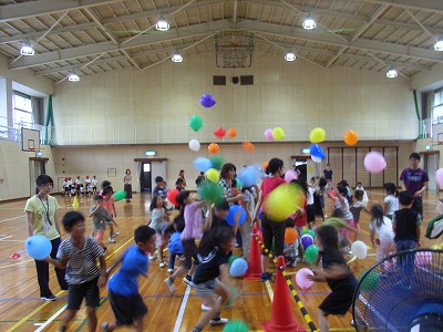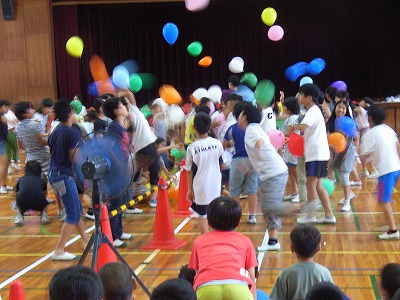 ペア学年(1年と6年、2年と4年、3年と5年)のつながりを深めようと、児童会が企画しました。参加希望者を募り、ペア学年ごとに参加者を半分に分けて対戦しました。ルールは自分のコートにある風船を相手コートに投げたり打ったりして入れ、3分後の終了時にコートに残っている風船の数が少ない方が勝ち、というものです。見た目にもカラフルで、参加した子どもたちも楽しそうでした。