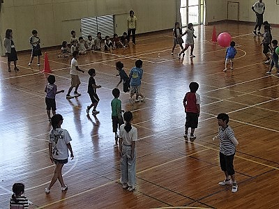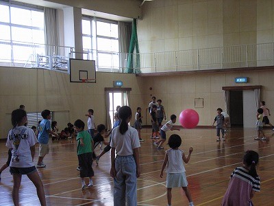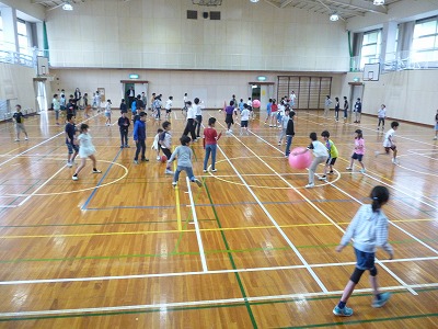 縦割りグループの「あいかつ班」内のつながりを深める目的で、2つずつのあいかつ班がペアを組み班全員参加で、なかよしタイムにドッジボールで対戦しました。ソフトバレーボール2個とバランスボール(写真にあるピンクの大きなボール)1個を同時に使い、バランスボールは4年生までしか使えないというルールで、全員が楽しめるよう工夫されていました。