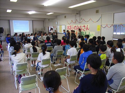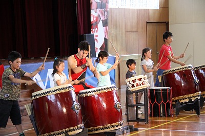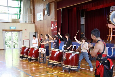 体験コーナーでは、児童と先生の代表が和太鼓体験をして拍手喝采でした。