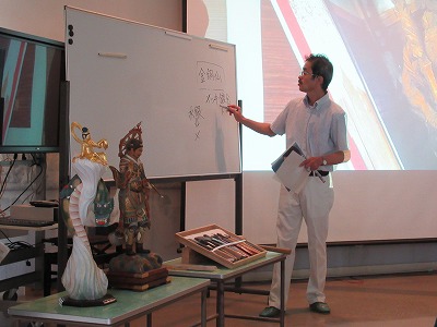 学校の近くにお住まいで、そこに工房を構えて仏像を制作してみえる大仏師の帆刈さんに来ていただき、仏像のことをいろいろと教えていただきました。帆刈さんが実際に制作された小型の仏像や、道具を見せていただき、子どもたちは興味津々でした。
