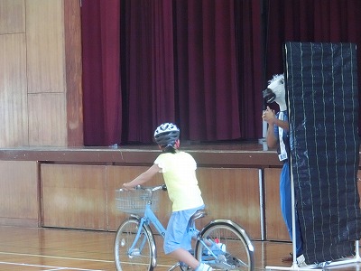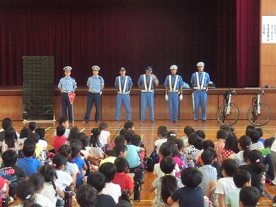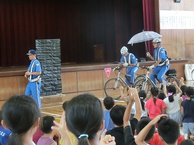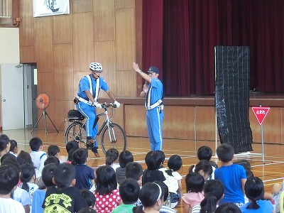 愛知県警の自転車対策小隊「B-force」のみなさんに来ていただき、自転車の正しい乗り方などについて、実演やクイズを交えて楽しく学びました。