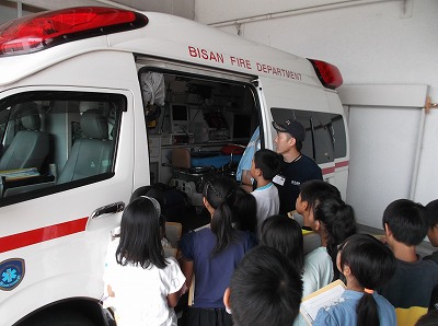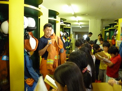 社会科「火事からくらしを守る」の学習で、消防署に見学に行きました。救急車や消防車、出動のための準備などに興味津々でした。