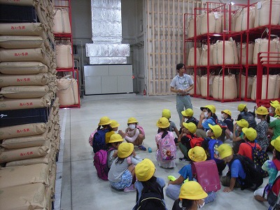 ライスセンターとは、もみの荷受から乾燥・もみすり・選別・出荷・保管という5段階の工程を行う施設だそうです 。これらの工程を、ほとんど全自動で、最新鋭の機械が行っていました。4枚目の写真は保管庫で、庫内の温度は約15度だそうです。左側に見える紙袋は30kg入り、右奥の円筒状の袋はなんと1トン入りだそうです。