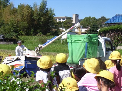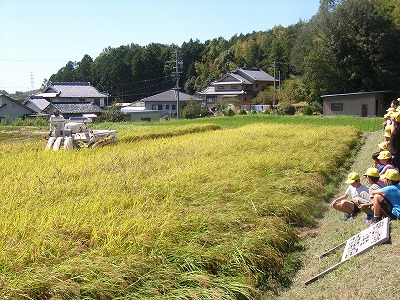 5月に田植え体験をさせていただいた、鈴木さんからお借りしている田んぼの稲刈り体験をしました。3年生全員が一束ずつ、鎌で刈る体験をさせてもらいました。その後、鈴木さんが機械での刈り取りと、脱穀の様子を見せてくださいました。
