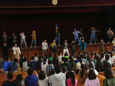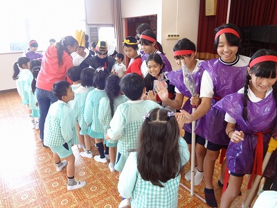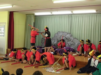 5年生は、総合的な学習の時間に、地域交流に取り組むことにしました。地域の一員として、地域の人たちのために何かできることはないかを考え、交流活動を計画・実行しようというテーマです。そこで、5年生全員で劇団を作って、地域の人たちに楽しんでもらおうという地域交流活動を考えました。その第1回公演として、この日、学校近くのハイランド白山幼稚園で「孫悟空」の公演を行いました。