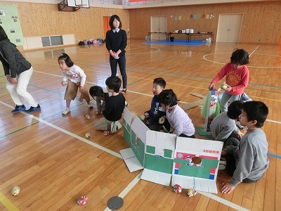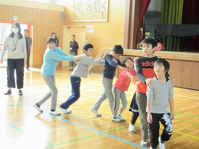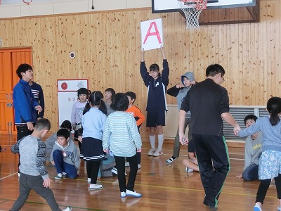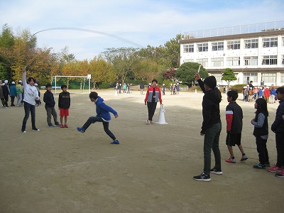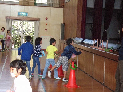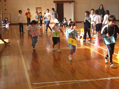あいかつ班対抗で、4班ずつ障害物リレーをしました。児童会役員が考えて、学年に応じた種目が割り当てられ、楽しそうでした。