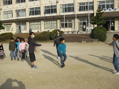 体育委員会の企画です。長なわで、低学年は時間内に何回跳べるか、高学年は連続で何回跳べるか、をクラス対抗で競いました。