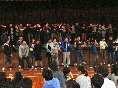 歌っている時の写真が撮れなかったので、本番前日に行われた学校での壮行会の様子と、市民会館大ホール前での集合写真です。
