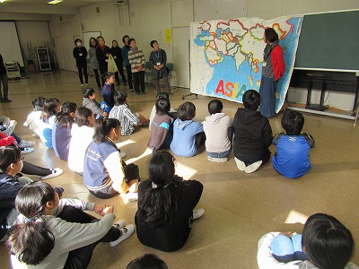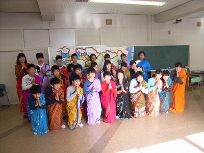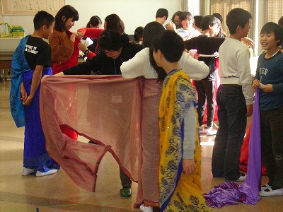 AHI(アジア保健研究所)は、日進市内にある、アジア各地の村々で人々の健康を守るために活動する現地の保健ワーカーを育成しているNGOです。そのAHIの方々に来ていただいて、国際理解のために「アジアを体験」する4つのワークショップ(サリーの試着体験、水運び体験など)を開いていただき、