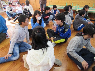 日東中校区の3小1中が東小学校に集まり、ゲームやクイズで楽しんだ後、自分でおにぎりを作りました。