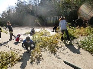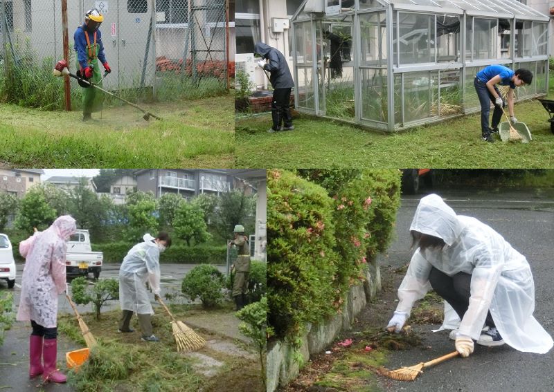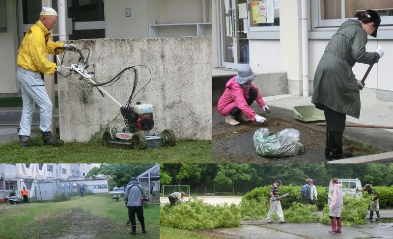 運動場南の斜面の土砂が流れ込み、側溝がつまったり、木が倒れる恐れがあったりしたため、そこを整地してくださいました。