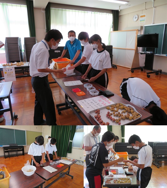 けやき組が心を込めて育ててきた野菜の収穫が本日で完了しました。そして、その野菜を販売することによって実生活(社会)で多く経験する買い物の場面、お店としての販売練習、おつりの計算を行いました。じゃがいもは10gで3円、キャベツは大小それぞれ値段が違い、大は50円、小は30円での販売でした。じゃがいもについては、先生方が欲しいものを選んで袋に詰め、グラム数を量って金額を伝えていました。