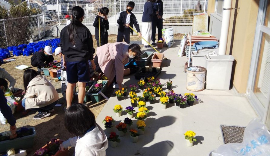 さて、園芸委員の皆さんが花のプランターづくりをしてくれました。これから卒業式や入学式に向けて、学校を春の装いにしてくれます。紫やピンク、そして黄色がとってもきれいです。学校が華やかになって、皆の心に潤いがうまれます。ありがとうございます。