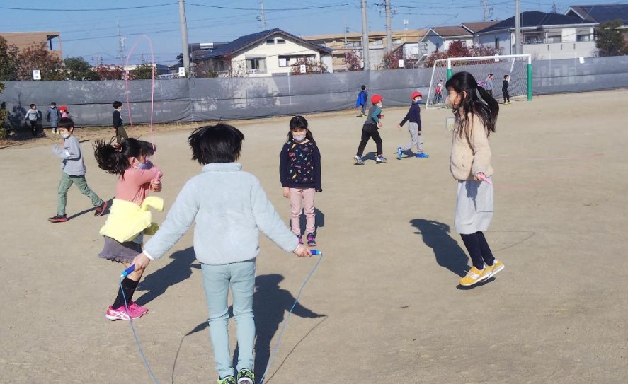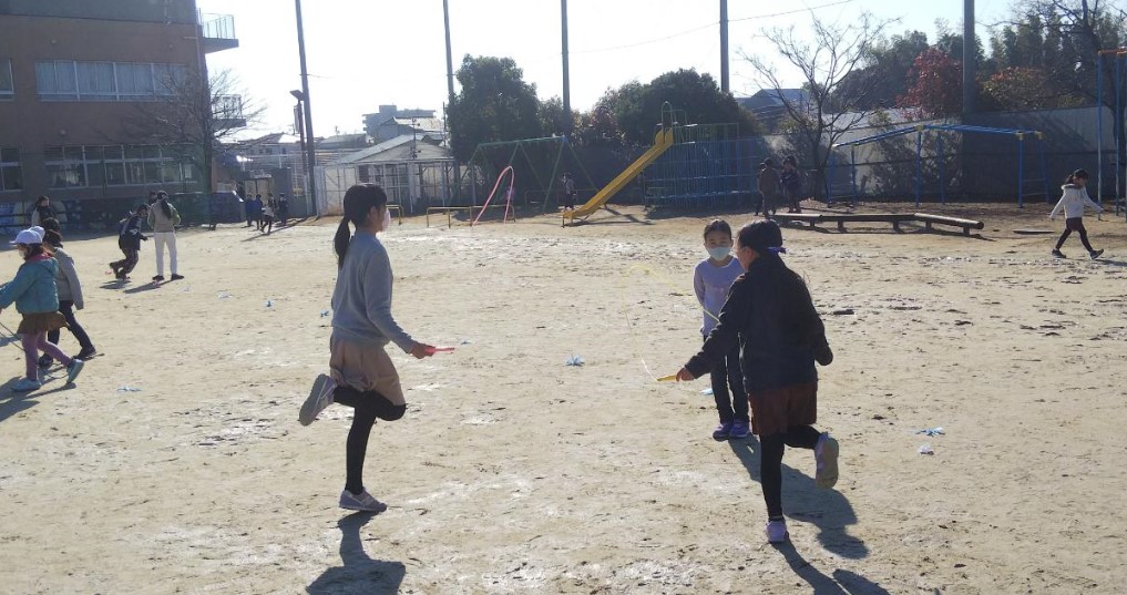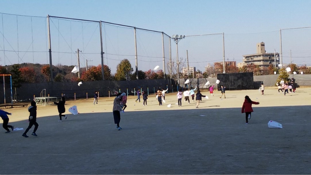 9:00頃からは抜けるような青空になりました。1年生は自分でつくった凧をあげて元気に駆け回っています。ハッピータイムになって、多くの子供たちが楽しそうに遊んでいます。縄跳びをしている子も多かったです。