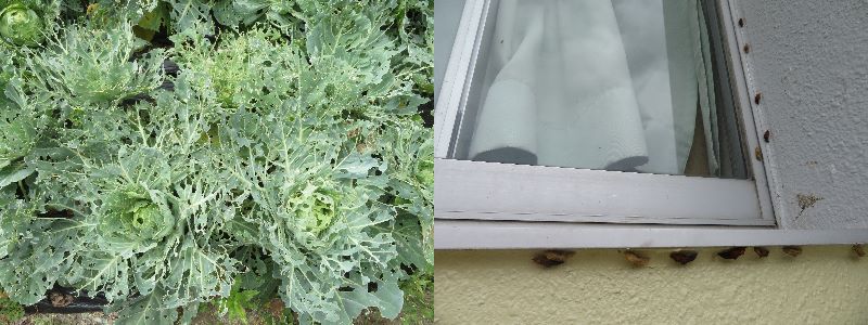 すべてのキャベツに無数の穴が開いています。それは、アオムシ(モンシロチョウの幼虫)が食べまくっているからなんです。キャベツ畑の近くの校舎の壁には、たくさんのさなぎがへばり付いています。成長したアオムシが壁に移動し、羽化するのに適当な場所を探して、そこでさなぎになるのです。