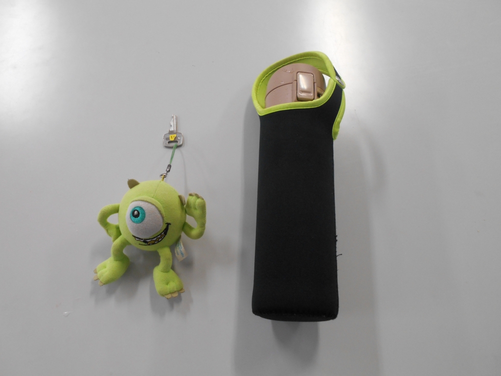 カギ(緑のキーホルダー)と水筒です。お心当たりのある方は教頭までお申し出ください。