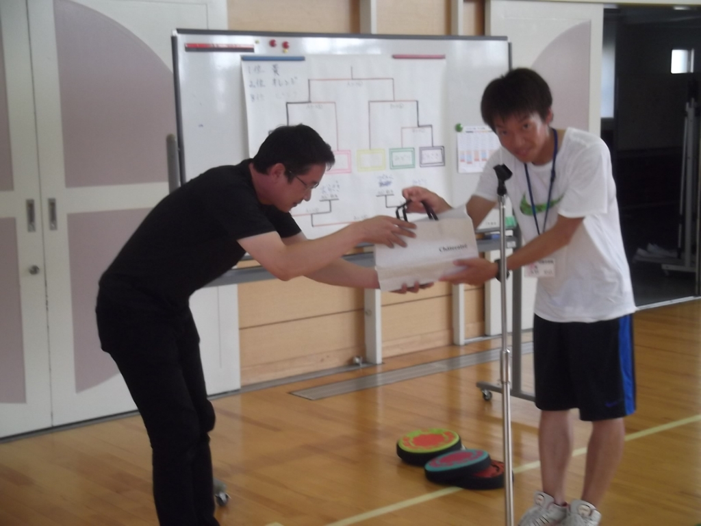 優勝チームを代表して水野先生(右)にPTA会長(左)から賞品が贈呈されました。一見すると立場が逆のように見えます。小野田会長の腰の低さがうかがえます。