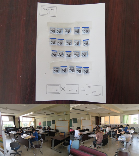前回は集会室(4階)での作業だったため、熱い中での作業でした。本日は生徒がテスト期間であるため、空調がきいている2階の多目的室で行いました。細かな作業であるため、扇風機は回せません。(きれいに切ったベルマークが、風で飛んでしまいなくなってはいけない・・・。)