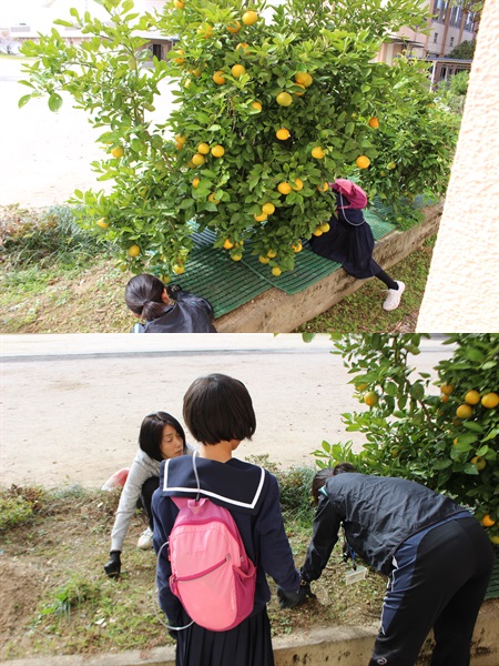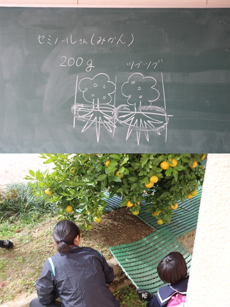 花壇に植えてある「みかん」の木に「肥料をあげる」授業をしていました。