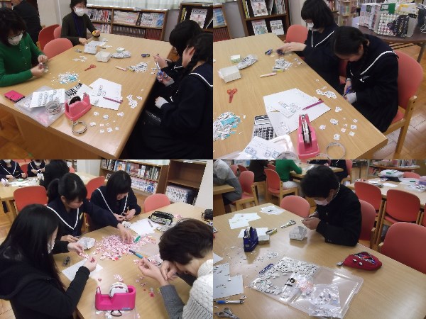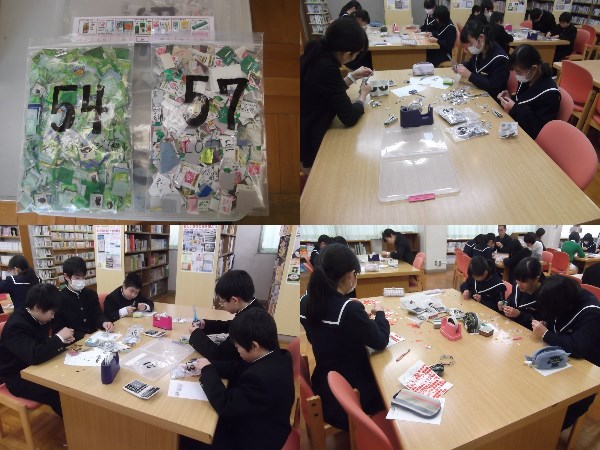 ベルマーク集計作業は、図書室の広い机を利用して行います。事前に厚生委員さんが種類別(企業別)に仕分けしたベルマークを1枚1枚きれいに切り揃えます。切り揃えたベルマークを台紙に貼り付け点数を計算します。細かく根気のいる作業です。生徒の協力のおかげでかなりはかどりました。ありがとうございました。