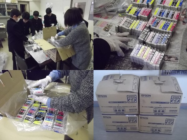 インクカートリッジの仕分け作業はPルームで行いました。5人の1年生男子が協力してくれました。エプソン、キャノン、ブラザーの純正品をメーカー別に分けて、互換品は取り除きます。純正品をメーカーごとに個数を数えて箱にぎっしり詰めていきます。インクが手に付くのでゴム手袋をはめての作業しました。約1時間半の作業で4箱分(約2000個)の箱詰めが完了しました。厚生委員だけで作業するよりはるかにはかどりました。明るく元気な5人のみなさん楽しく作業できましたよ。ありがとうございました。
