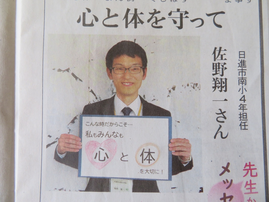 現在、中日新聞朝刊「なごや東版」に、「先生からのメッセージ」というコーナーがあります。本日、本校の佐野翔一先生(4年2組担任)の写真とメッセージが「心と体を守って」というタイトルで掲載されました。南小学校の重点努力目標の中に、「自分の命(身)は自分で守る」があります。佐野先生のメッセージにもあるように、大変な時期だからこそ、自分と同じように周りの人の心と体も守るよう意識したいですね。