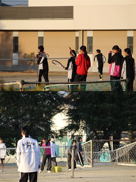 運動場で活動している「テニス部男女」の様子しか見られません。