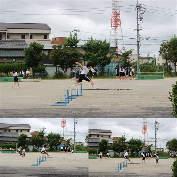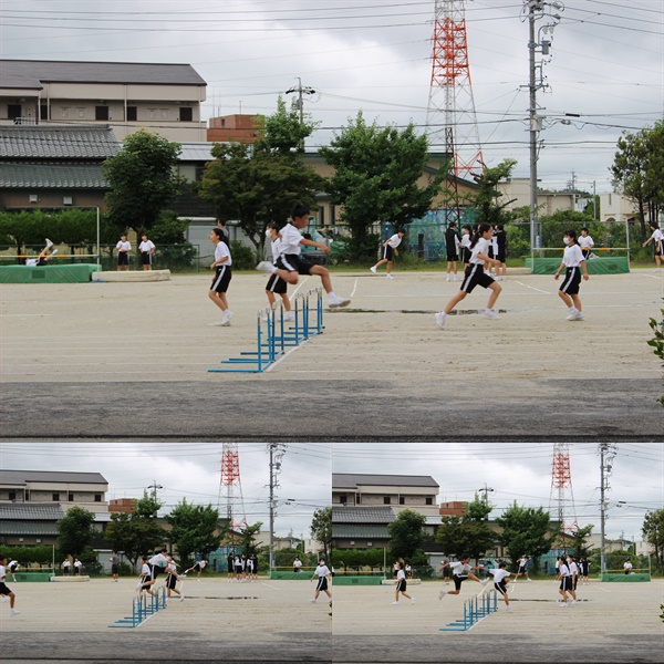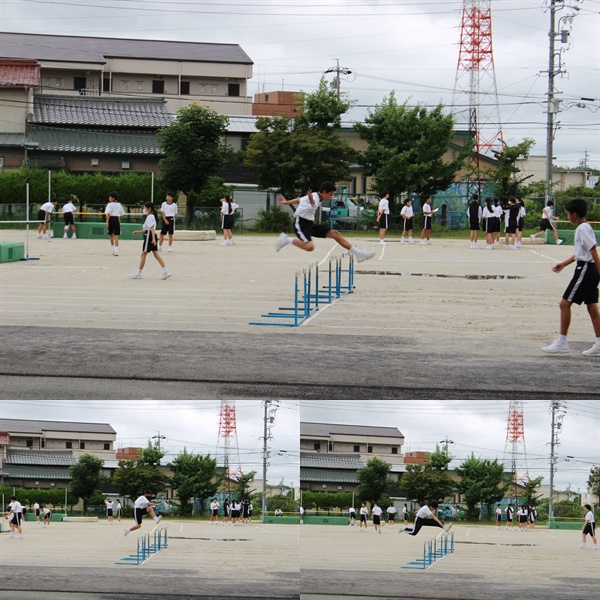現在、1年生が体育の時間を使って「ハードル」「高跳び」をしています。